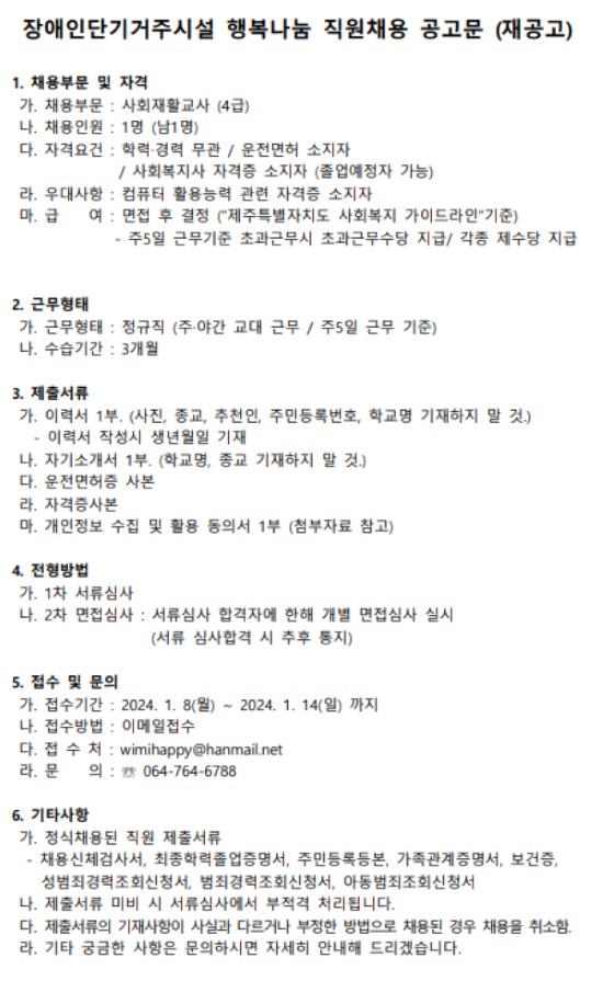 장애인단기거주시설 행복나눔 직원채용 공고문(재공고)